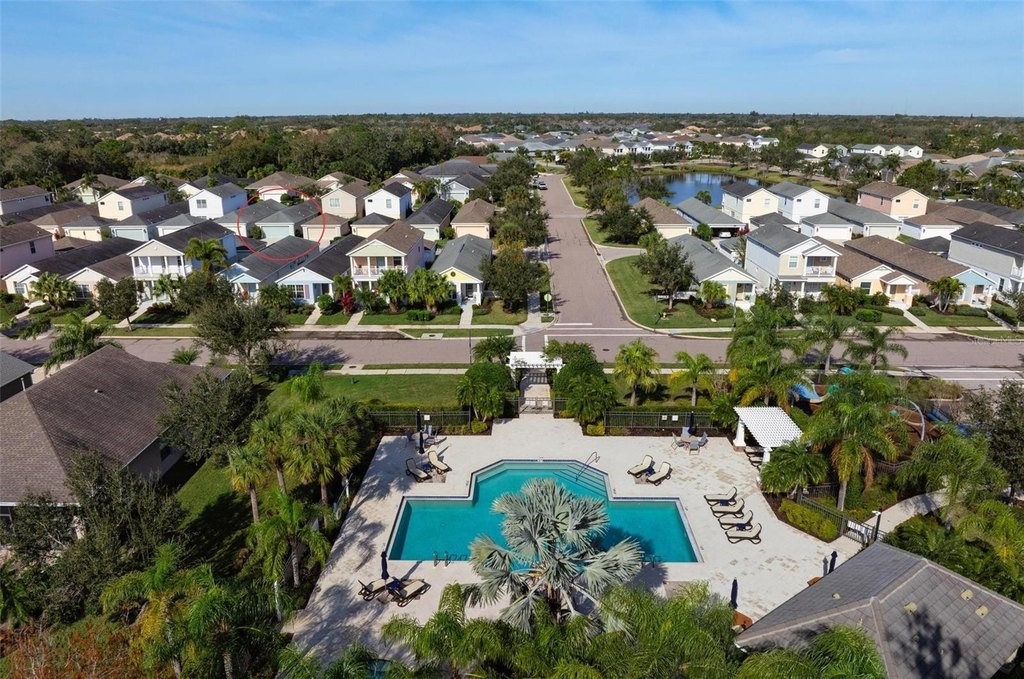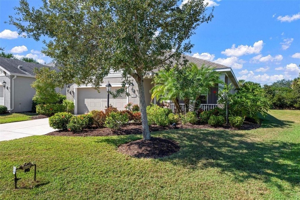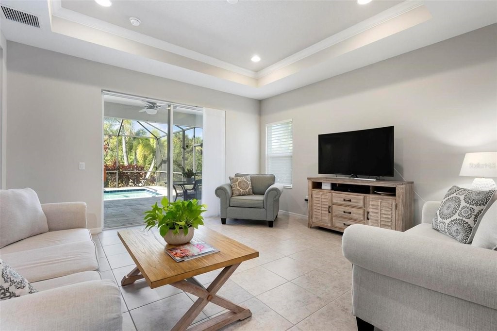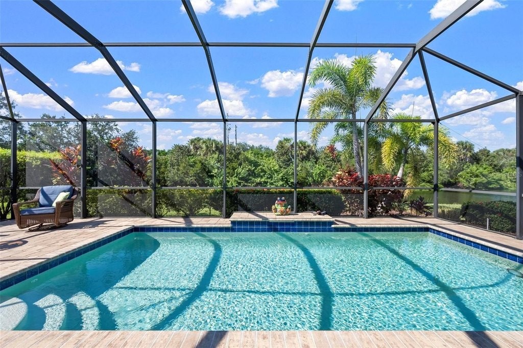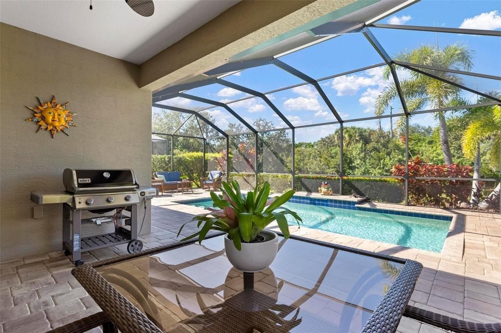 Immaculate and move-in ready! Stunning POOL home that lives LIKE NEW! Built by award-winning Neal Communities in 2016, this beautifully maintained 3-bedroom plus DEN residence is nestled within the gated community of Woodbrook. Welcoming covered front entry leads into the spacious foyer. Bright, open great room layout with neutral and timeless design throughout; tray ceiling, recessed lighting, and Hunter Douglas window treatments. Sliding doors open to an extended screened lanai with bronze enclosure, heated inground pool, stone paver deck, and covered seating area with ceiling fan and gas hook-up, perfect for effortless indoor-outdoor living. Inviting kitchen features shaker-style cabinetry with crown molding, dual granite countertops, tile backsplash, GE stainless steel appliances with gas cooking, center island with counter-height seating, and a spacious walk-in pantry. Serene primary suite offers a large walk-in closet and ensuite bath with tiled walk-in shower and dual vanities. Two additional bedrooms share a well-appointed full bath. A versatile den with French doors provides the ideal home office, media room, or playroom. Additional highlights include a large indoor laundry room with GE washer and dryer, multiple storage closets, and a two-car garage with epoxy coating on floor. Furnishings available under separate contract. Enhanced landscaping and a wider right side yard give you privacy. Palm Leaf Court is a small circle of 8 homes with landscaped center. Residents of Woodbrook enjoy a resort-style heated pool and spa, cabana, outdoor grill area, playground, park, and scenic walking trails. Conveniently located near UTC shopping, fine dining, cultural attractions, downtown Sarasota and Bradenton, pristine Gulf beaches, top-rated golf courses, and Sarasota-Bradenton International Airport. Comfort and style – all just minutes from everything you need.